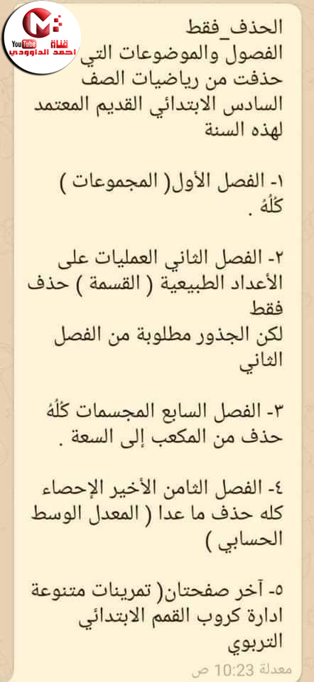 ادناه صور المواد المحذوفه والفصول المحذوفه للمواد الخاصه بمنهج السادس الابتدائي بعد القرارات الصادره من هيئة الرأي في وزارة التربيه للعام الجديد 2020 - 2021 للمواد التاليه .. التربيه الاسلاميه والعلوم والاجتماعيات والرياضيات واللغه العربيه واللغه الانكليزيه .