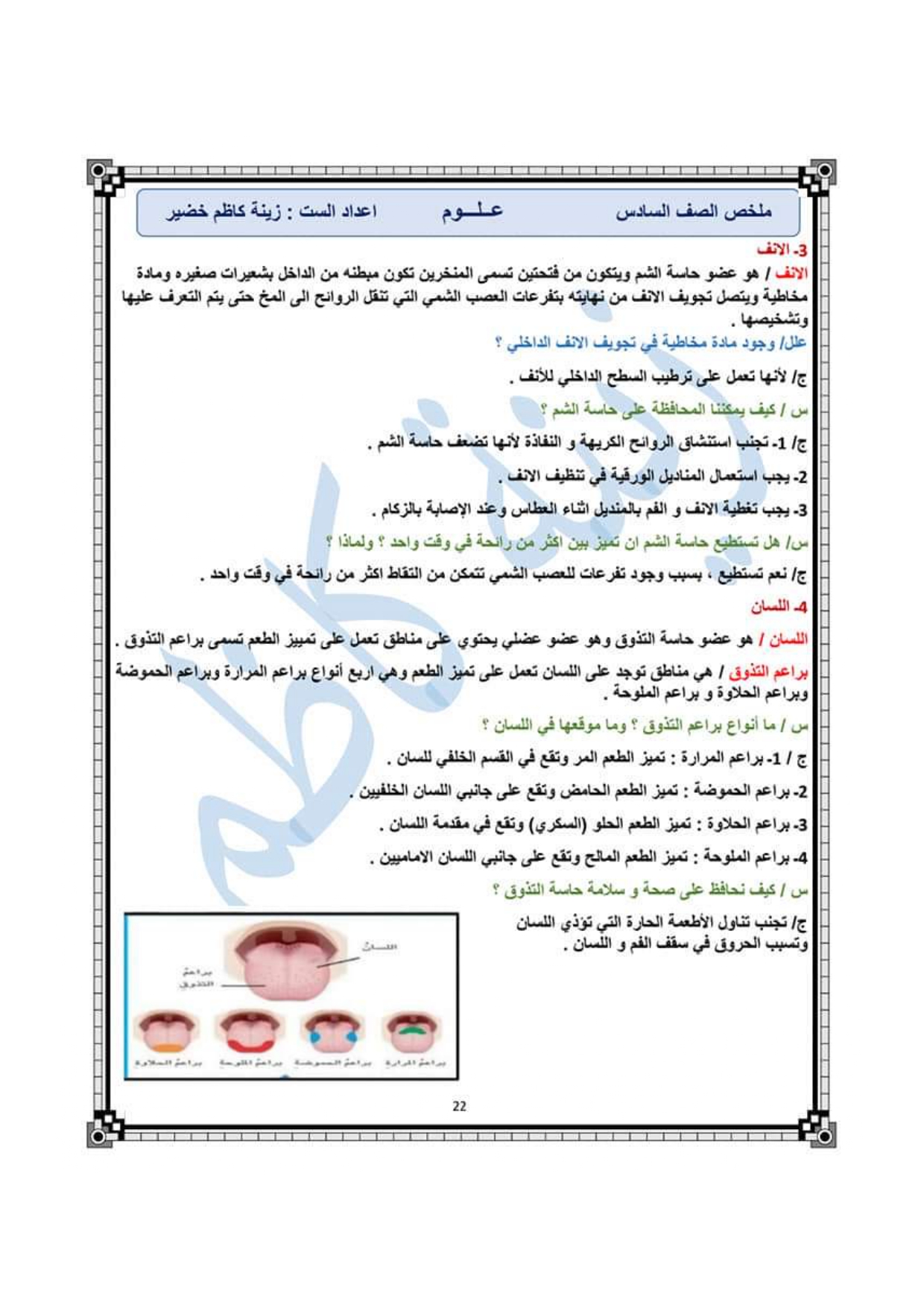 ملزمة علوم السادس الابتدائي بعد الحذوفات الاخيره للعام 2020-2021 للست زينه كاظم