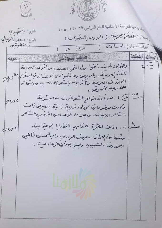 هذا النموذج ادناه خاص بمادة اللغه العربيه للدراسه الاعداديه